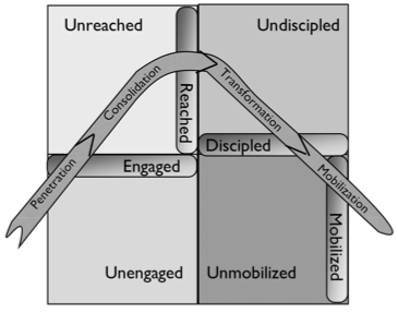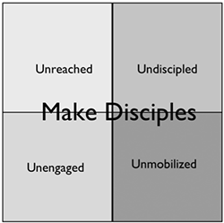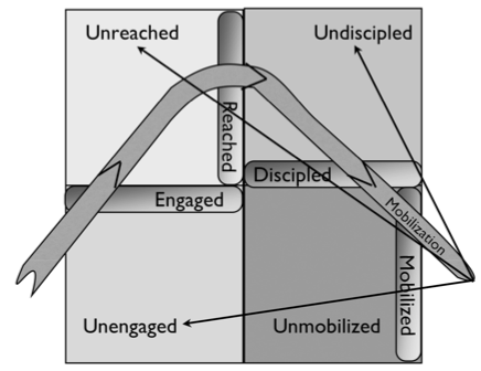 Starting with the bottom left quadrant (unengaged) and moving clockwise from one to the next, the four spheres of need include peoples who are: 1) unengaged, 2) unreached, 3) undiscipled, 4) unmobilized. Each segment represents a specific area of Great Commission concern, represented by a specific quadrant of the overall matrix of "Make Disciples."